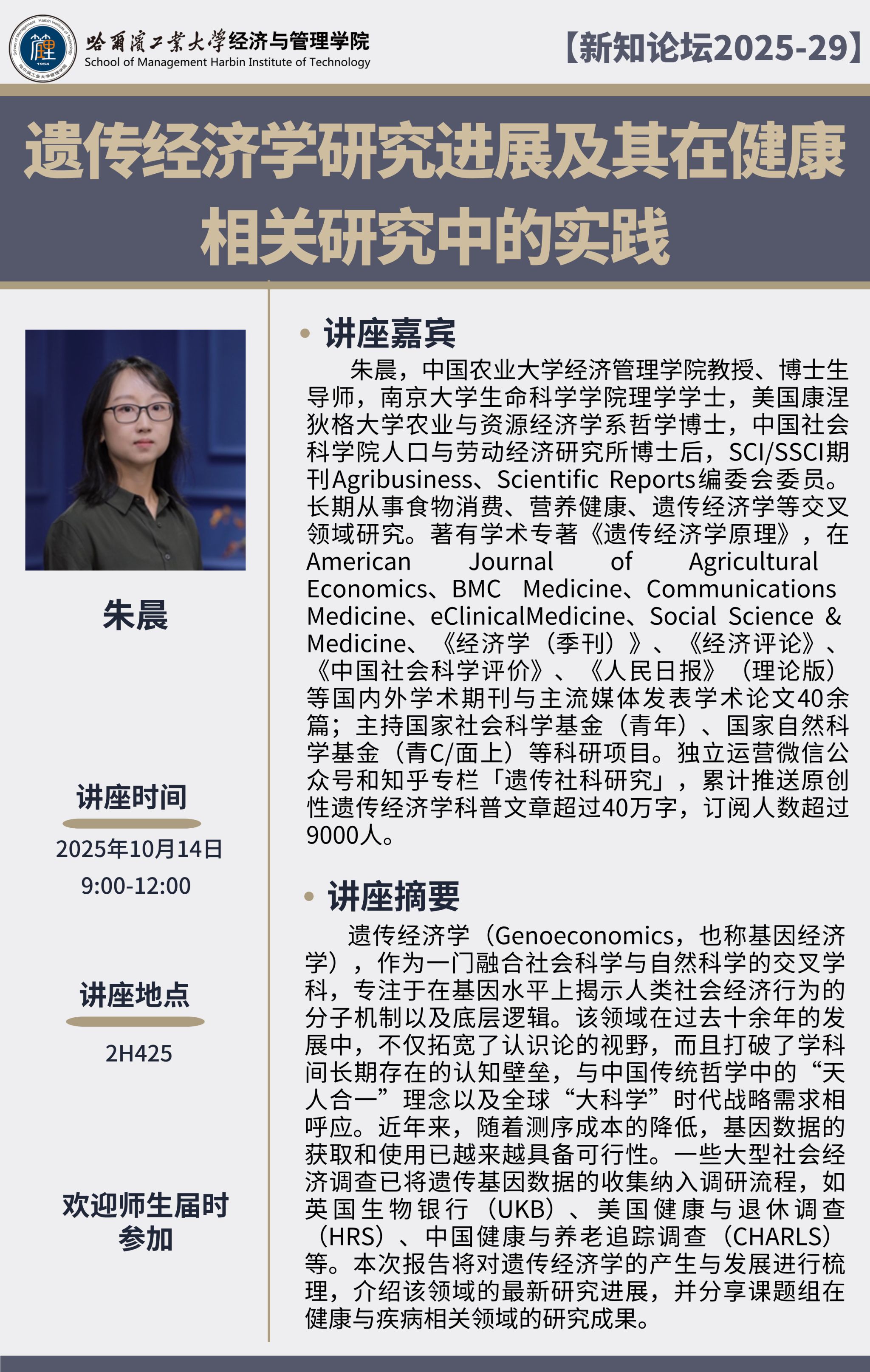 讲座主题:遗传经济学研究进展及其在健康相关研究中的实践