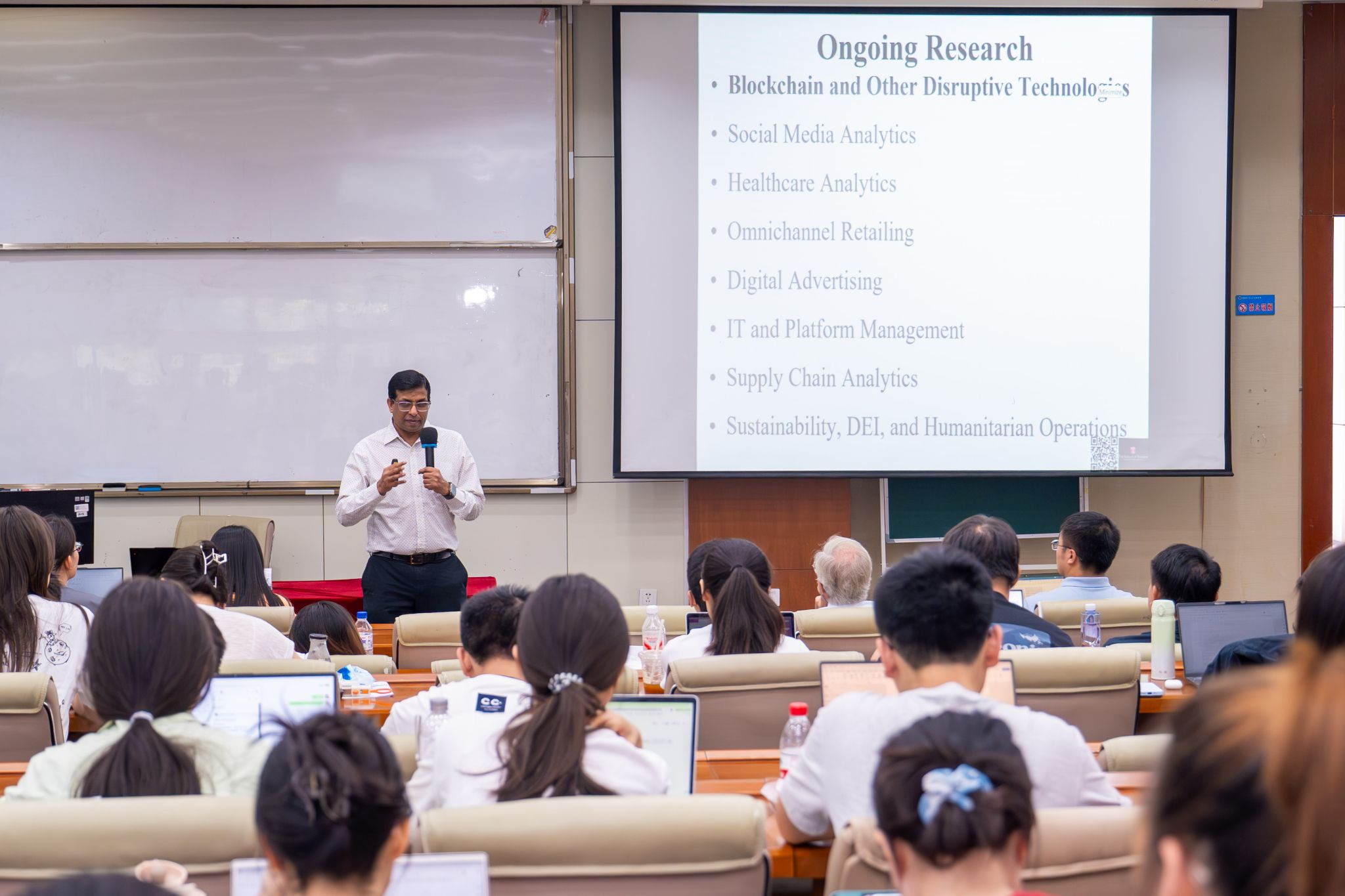 Kumar教授以《Navigating the Future: Business Analytics and Disruptive Tech Trends in IS and Related Domains》为题,分享了团队当前正在推进的系列研究,覆盖区块链、社交媒体分析、医疗健康、全渠道零售、数字广告、供应链智能管理、平台策略、可持续发展、DEI(多样性、公平与包容)、人道主义运作分析等多个方向。Kumar教授从理论建模与实证分析的双重视角出发,深入剖析了商业分析如何赋能平台治理与组织转型,为青年学者提供了兼具学术严谨性与实践指导意义的系统研究路径。
