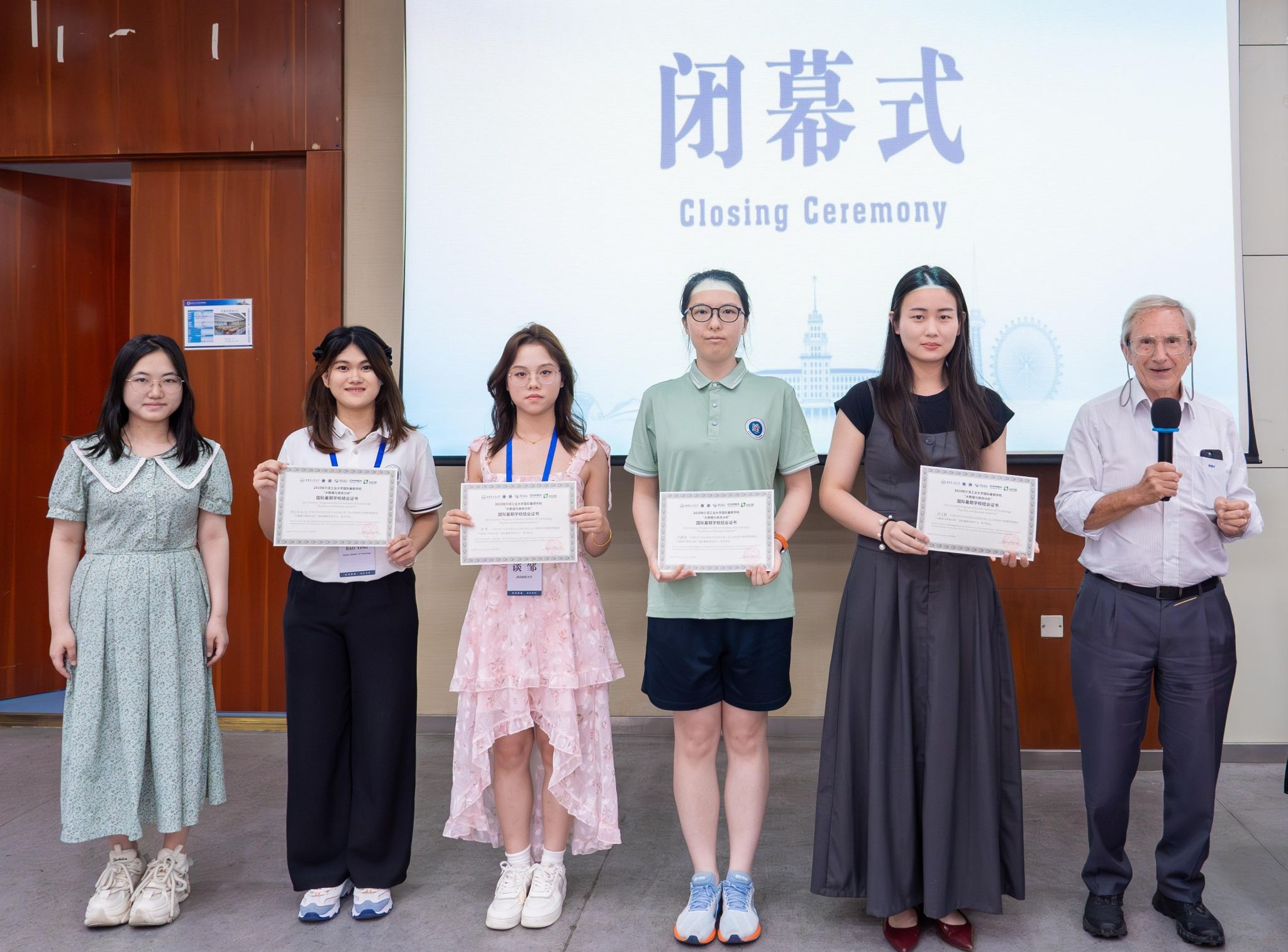 在闭幕式的最后,由美国波士顿大学Bin Gu教授和哈尔滨工业大学Doug Vogel教授向各班级代表颁发结业证书。最后,全体师生合影留念,第十一届"大数据与商务分析"国际暑期学校正式闭幕。
