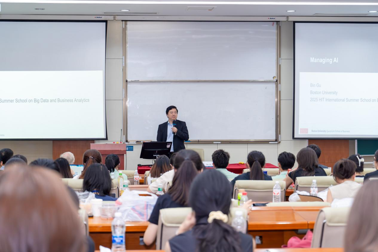 闭幕式邀请美国波士顿大学商学院信息系统系主任Bin Gu教授代表授课教师致辞。他肯定了本次夏校的学术深度与国际视野,赞赏哈工大为全球青年学者搭建起“跨学科、跨文化、跨领域”的思想交流平台。他表示,期待未来与更多来自中国与世界各地的学生在数据与商业分析的前沿继续同行。