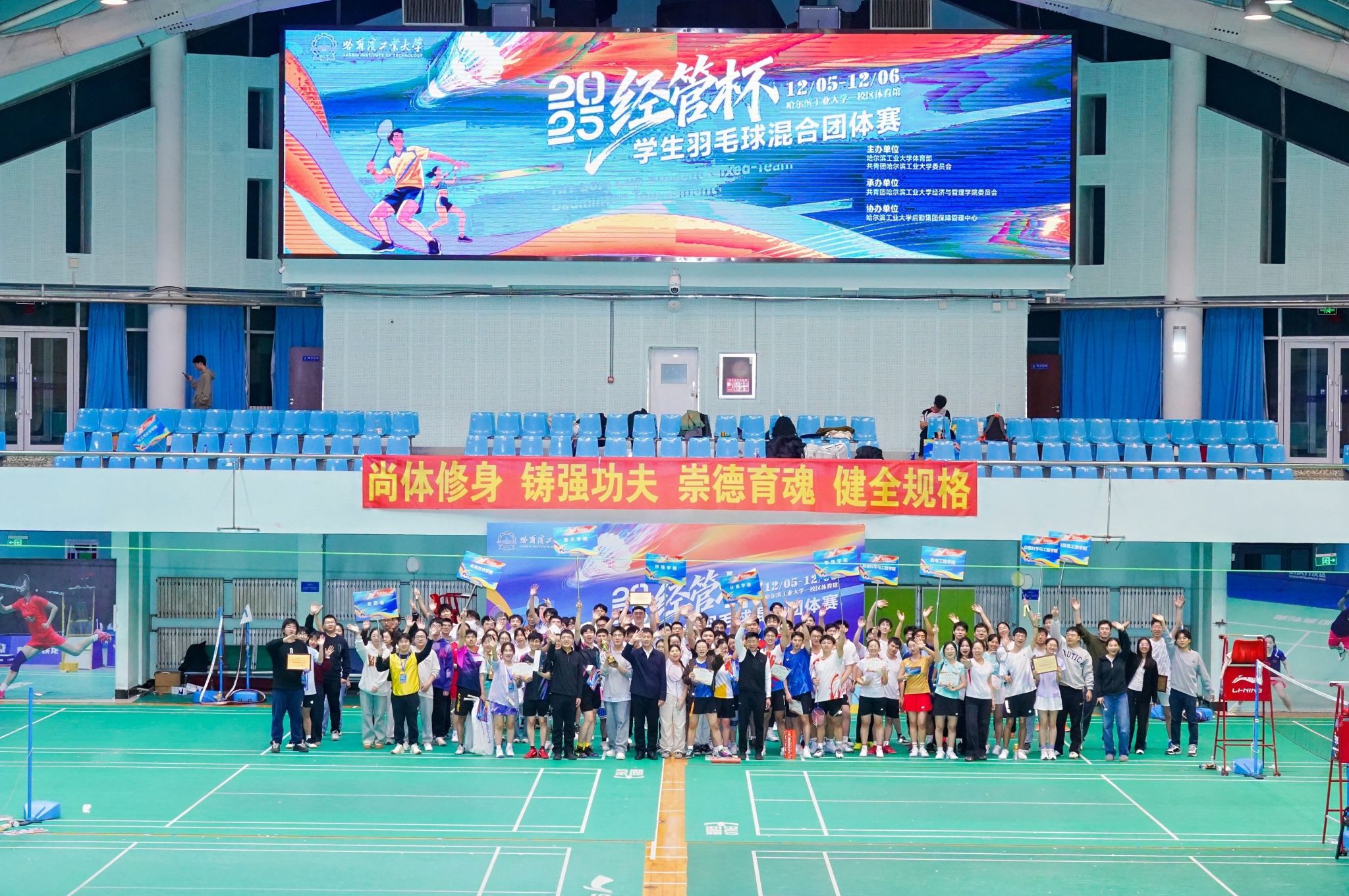 2025年12月5日至6日,由哈尔滨工业大学体育部、共青团哈尔滨工业大学委员会主办,共青团哈尔滨工业大学经济与管理学院委员会承办,哈尔滨工业大学后勤集团保障管理中心协办的2025年哈尔滨工业大学“经管杯”学生羽毛球混合团体赛在一校区体育馆火热开赛。本次比赛吸引了来自全校21个学院(学部)代表队的207名运动员参赛,100余名学生裁判员、志愿者鼎力支持赛事有序开展,广大师生员工和校友线上“云观赛”,图片直播浏览量累计超200000人次,赛事规模再创新高,赛事影响力空前。