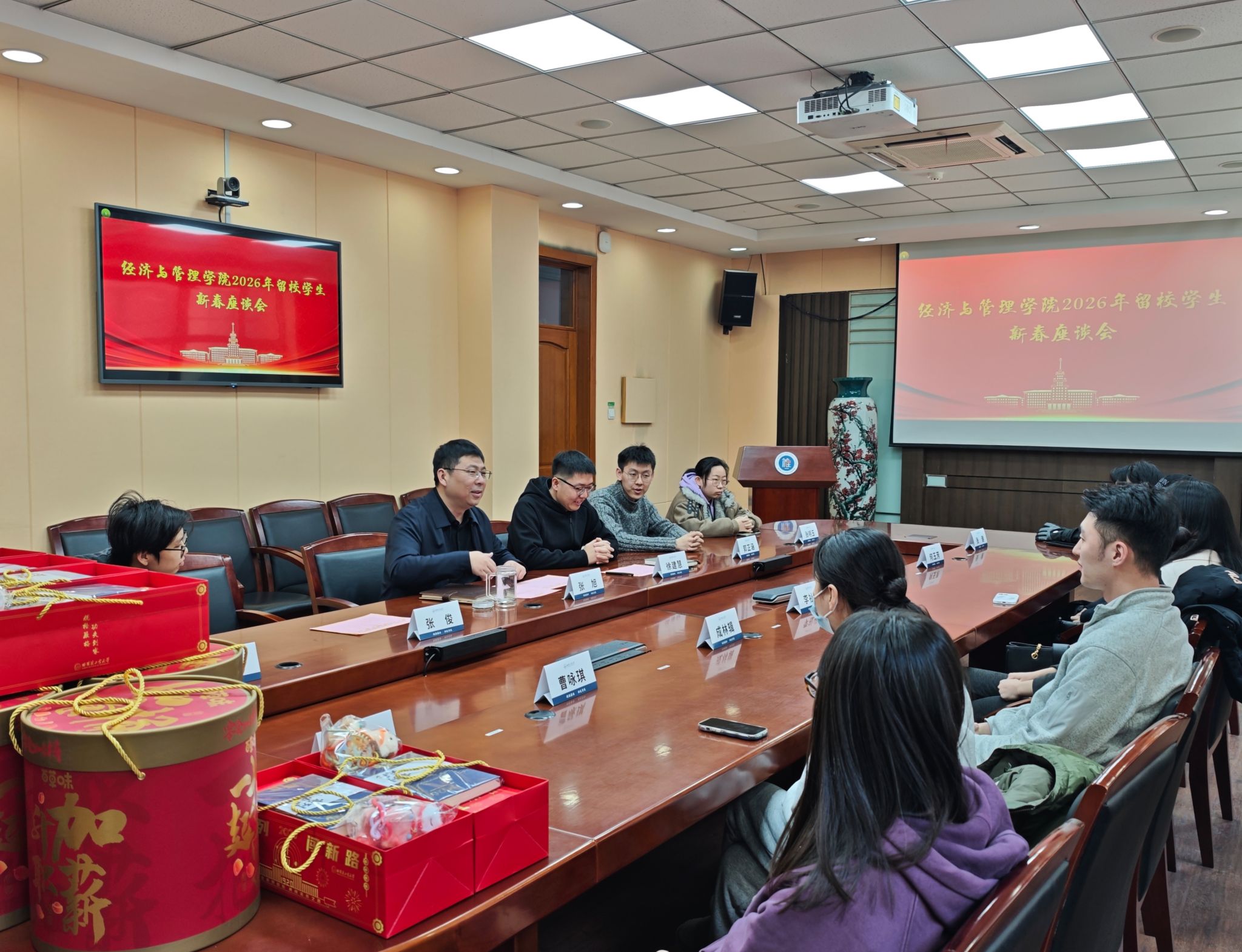 骐骥驰骋,势不可挡。2月13日,在丙午马年新春佳节来临之际,经济与管理学院举办留校学生新春座谈会。经济与管理学院党委书记张旭、党委副书记徐建慧、辅导员张俊及留校学生代表欢聚一堂,共话新春、畅谈未来。